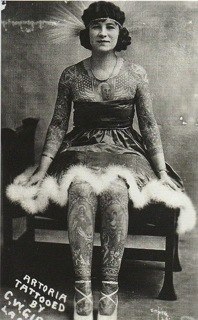 Charlene Anne Gibbons, Daughter of Charles “Red” Gibbons & “Artoria” Gibbons, one of the most renowned Tattooed Ladies of the twentieth century, tattooed by her husband, Charles Gibbons.