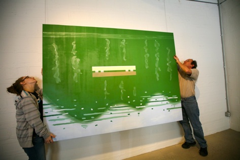 In the show, each artist’s work is presented as a project; items that demonstrate the process of its creation are included. Multiple versions of the final image of some works are displayed, and photographs and objects like screens, squeegees and empty paint cans accompany the pieces.