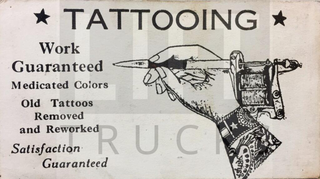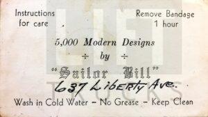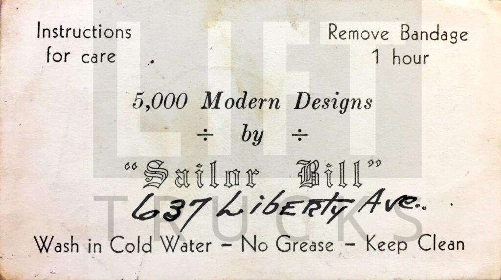 Below is a later business card from a Sailor Bill. Not at all sure it’s the same artist though. There is a Kistler K. “Sailor Bill” Killingsworth (1921-1997), but accordingly, he did not work the carnival circuit or have stand up gals like this. And there is no address like this in Georgia where Mr. Killingsworth set up his shop.